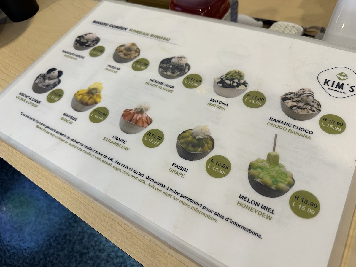 Welcome to Kims Bingsu & Boba, a delightful café located at 68 Av. Lafleur in Montréal, QC. This vibrant spot specializes in Korean Bingsu, offering a wide array of flavors that promise to tantalize your taste buds. Each Bingsu, priced at CA$9.99, features fluffy shaved ice topped with various delicious ingredients. Indulge in favorites like Honeydew, Peach, and Matcha, or explore unique combinations such as Injeolmi and Banana Chocolate.